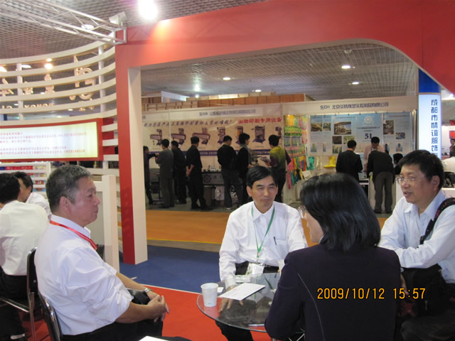 俞清秀社長(左二)、中國紡織品協會副會長彭桂福さん(左一)と浙江省労働保護協會秘書長王良基さんは労働保護用品の未來性と製品の革新について商談中。